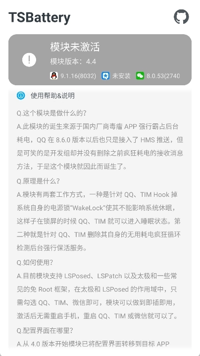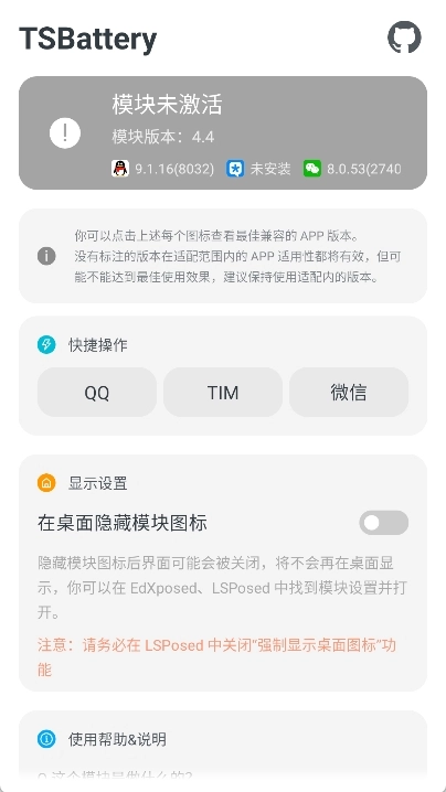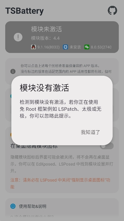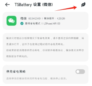 要是在微信设置界面的右上角找不到TSBattery图标,可以试试把WeXposed(微X模块)也激活。