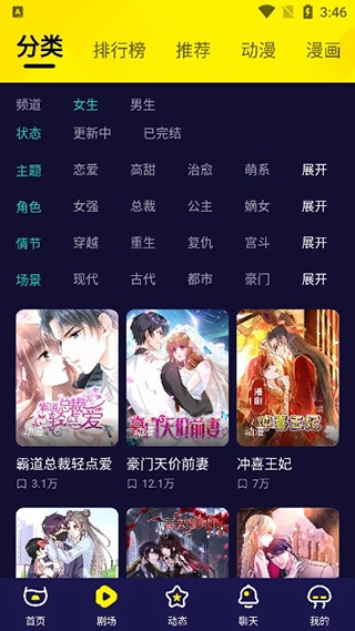 3、分类栏目涵盖总裁、古风、穿越等多种题材,用户可根据兴趣自由选择;