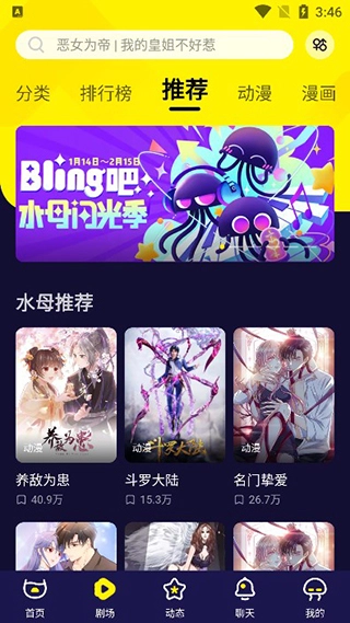 水母动漫是由北京弹幕网络科技有限公司开发的一款专注于移动端漫画阅读的应用,是一款集漫画、动画、社交互动、短视频与桌游为一体的综合型看漫平台。在这里用户可以畅享来自全球的丰富动漫资源,涵盖恋爱、宫廷、古代、豪门、萌宠等多个题材类型,并配备高效的搜索系统,让查找内容更加轻松快捷。 该应用中的动漫以短视频形式呈现,点击即播,随时随地享受观看乐趣。在播放过程中,不仅支持发送弹幕互动,还能查看其他用户的实时评论,增添观看趣味性。同时,用户可对作品进行评论,分享自己的观后感,与其他漫迷交流观点。此外,水母动漫还构建了一个友好的社区环境,用户可以发布动漫相关的图文动态,表达想法,也可以加入群聊,与众多同好在线互动,边看边聊,拓展社交圈。喜欢动漫的朋友不妨体验一下。ps:如果水母动漫无法使用了,可以尝试快看漫画,拥有1万部精选漫画资源,全部免费观看。