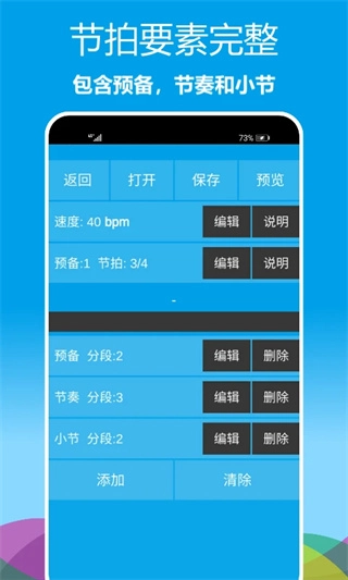 点击相关功能进入设置页面,在页面中对速度、预备节拍等参数,以及各分段内容,通过编辑、删除、添加、清除等按钮进行调整配置,完成个性化设置。