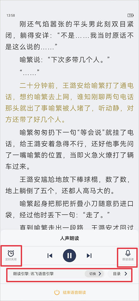 点击后就能开始听书了,另外你还能设置听书的定时关闭、朗读的语速,以及切换语音等功能。