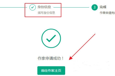 接着进入作家身份信息板块,填写个人姓名与住址,完成填写后页面会显示申请成功,此时进入作家主页就可以了。