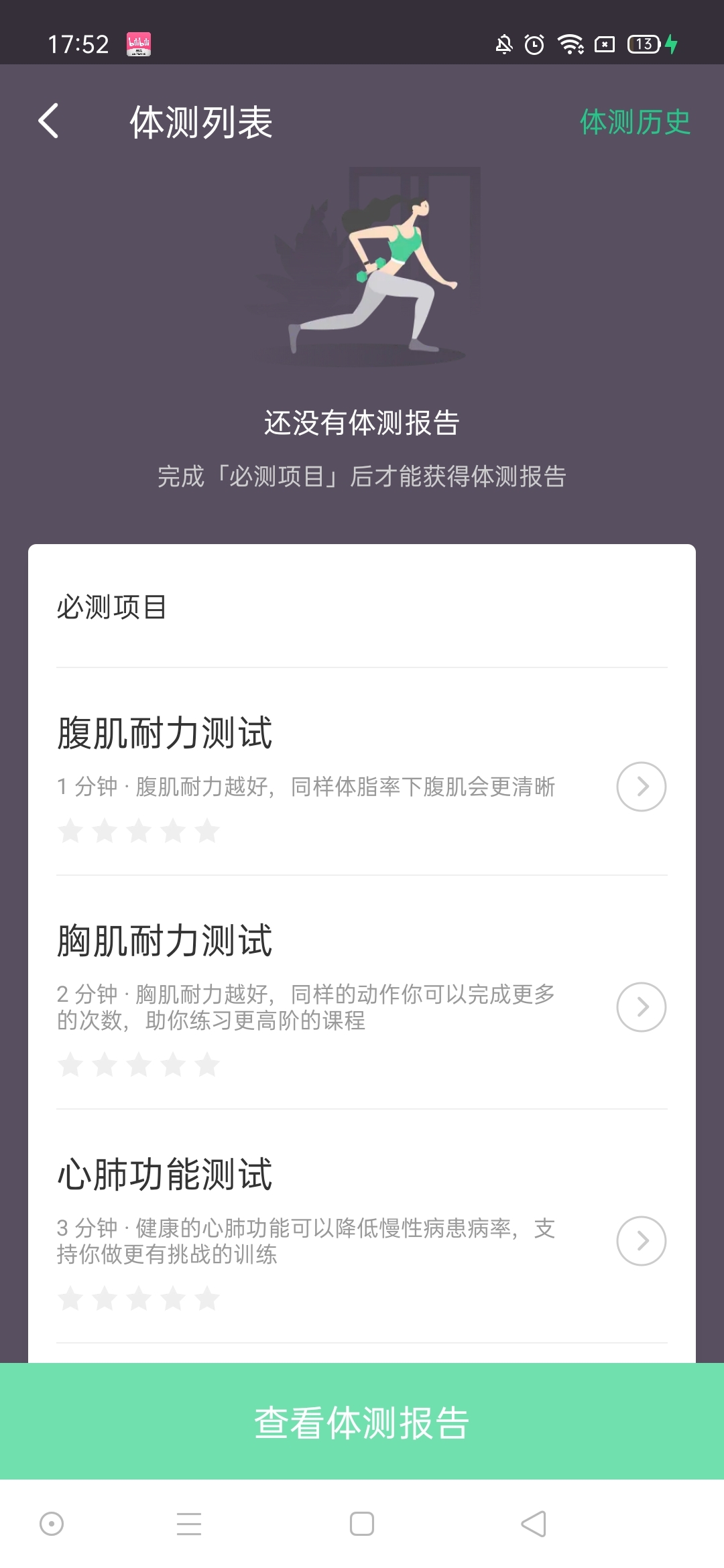 最后,我们只需在【个人中心】里找到【身体测试】选项,接着点击【体侧列表】下方的【查看体测报告】按钮就可以了。