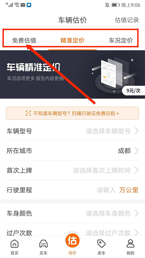 进入【车辆估价】界面,该界面包含【免费估值】、【精准定价】和【车况定价】等不同的估价类型,用户可依据自身需求选择对应的类型,接下来以【免费估值】为例进行说明。