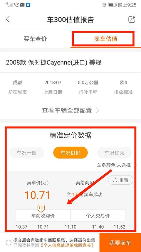 进入【卖车估值】页面后,能看到当前车辆对应的卖车价格、车商收购价格以及个人交易价格。