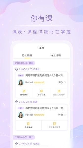 这款提供在线外教课程的英语学习软件,首页的课程信息清晰明了,你可以随时随地安排课程、预约课程,课程表的详细情况尽在掌握。坚持学习后,英语水平确实提升了很多,欢迎你来皮皮鲲站体验。