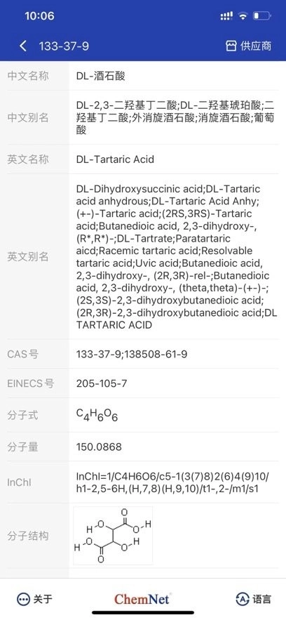 化工字典是中国化工网开发的工具,主要用于查询化学品的登记信息、物化信息以及结构信息等内容。目前,该字典能够检索到180多万条化学品数据,用户可以通过输入中文名、英文名、别名或者CAS登记号(即美国化学文摘登记号)等信息来进行检索操作。此外,对于部分化学品,化工字典还提供了查询相关供应商的功能。