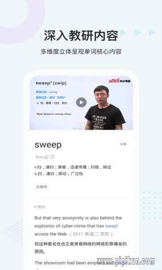 对单词进行详尽的多维度讲解,涵盖读音、释义、真题例句、词根词缀、配套图片、视频解析以及记忆技巧等内容。