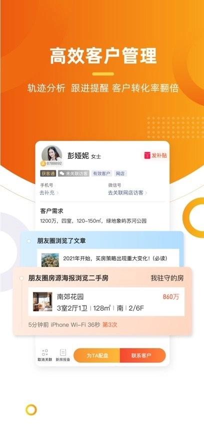 多多卖房汇聚了全国范围内的新房热销楼盘、海量二手房源以及租房信息等全网真实房源。房产经纪人能够借助分享房源楼盘信息和房源楼盘海报至微信朋友圈来获取客户,从而激活朋友圈中潜在的意向客户。此外,客户的访问动态信息会得到即时提醒,并且通过房多多大数据分析提炼出购房者的需求画像,助力房产经纪人精准把握买房客户的需求,提高卖房的效率。