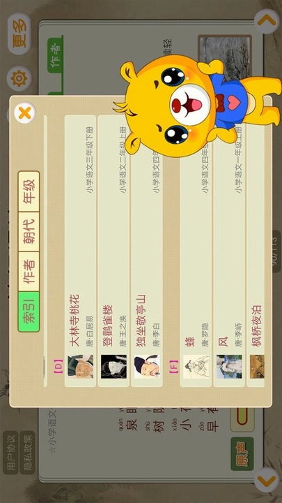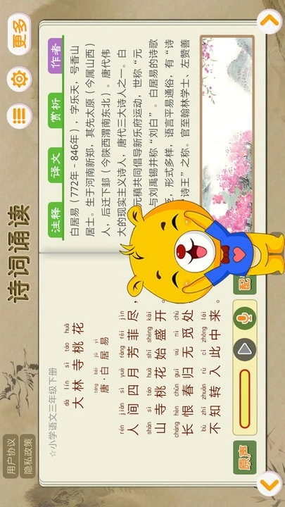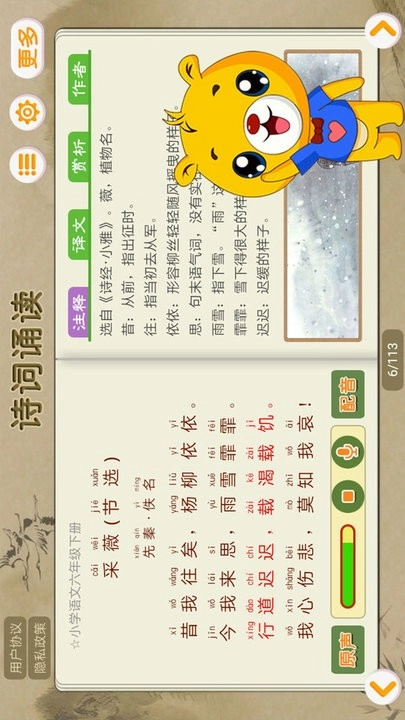 便捷性体现在多方面:支持按名称、作者、朝代、年级等多种维度进行索引;同时提供多种播放模式供选择,能很好地满足学生课前预习和课后复习的即时需求。