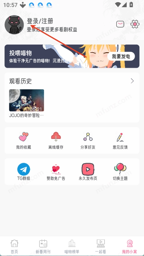 进入喵物次元动漫的主界面后,找到底部导航栏中的“我的小窝”选项并点击,即可进入个人中心页面。