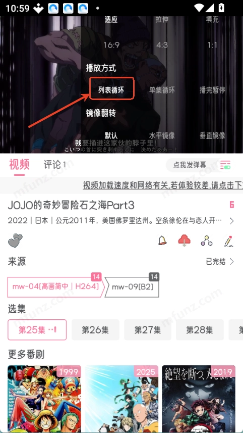 从弹出的播放模式选项中选择“列表播放”,设置好之后,当前剧集播放完毕就会自动接着播放下一集了。