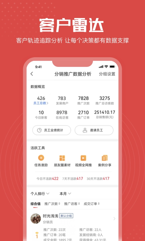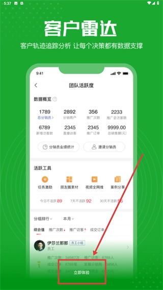 在“客户雷达”介绍页面,点击【立即体验】按钮,即可进入该应用的功能使用流程。
