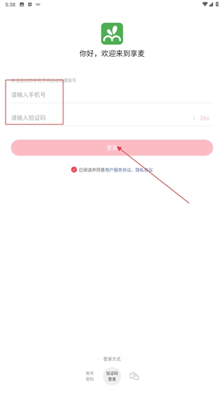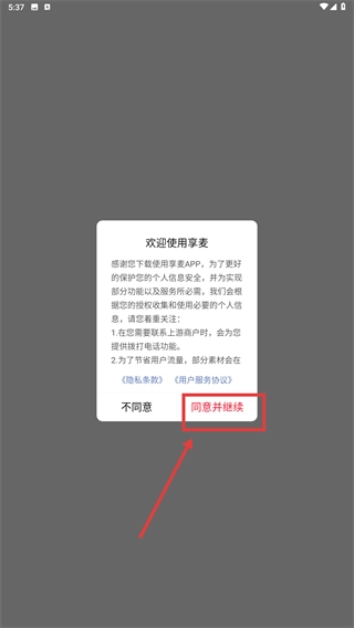 在享麦的欢迎弹窗里,点击【同意并继续】按钮,通过授权隐私条款来进入应用。