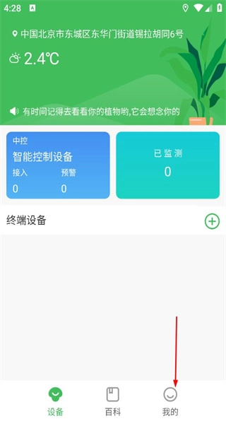 打开森林甜心应用,进入设备页面后,可查看中控设备等相关信息,接着点击底部的“我的”选项,就能进入个人页面。