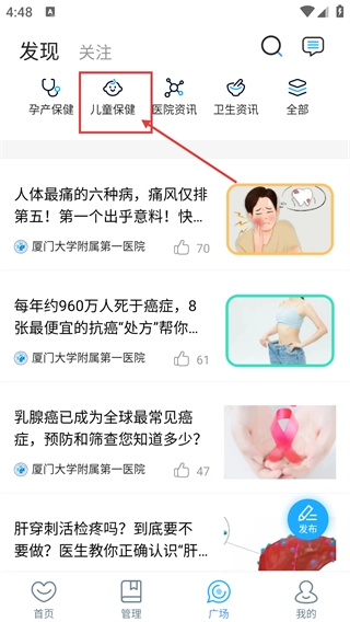 打开应用后进入【发现】页面,找到并点击【儿童保健】选项,就能进入到对应的健康科普文章分类板块。