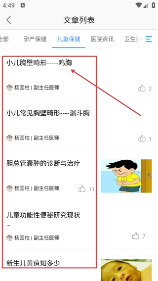 进入【儿童保健】的文章列表页面后,点击《小儿胸壁畸形----鸡胸》这篇文章,即可进入其内容详情页。