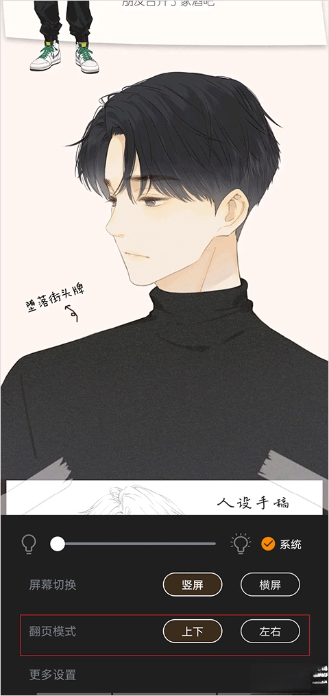 在漫画界面点击后会弹出设置选项,在设置里能够切换翻页模式,挑选你熟悉的方式就可以了。