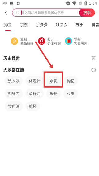 在搜索页面中,点击“大家都在搜”板块里的【水乳】关键词,就能快速触发该类商品的搜索流程。