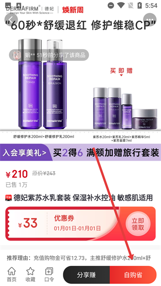 在商品详情页领取对应的优惠券后,点击【自购省】按钮,即可推进该商品的优惠购买流程。