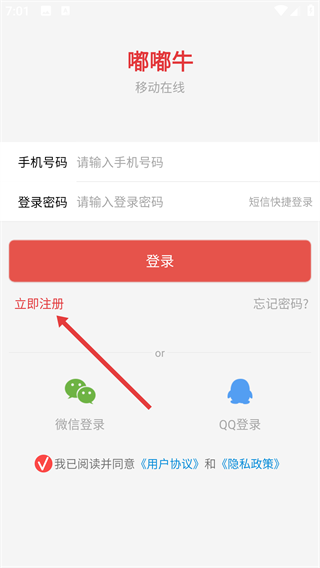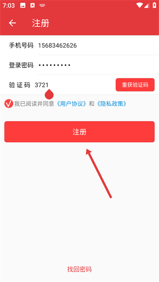 在注册页面,按顺序填写手机号码、登录密码,再输入收到的验证码,确认勾选相关协议后点击【注册】按钮。