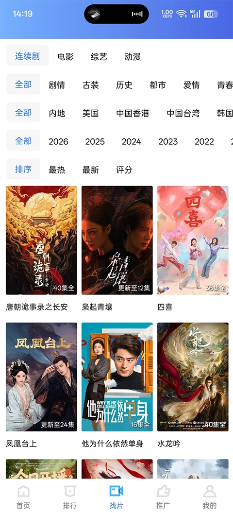 打开软件后,点击首页的“找片”按钮,接着通过“电视剧/电影/综艺/动漫”这些标签来快速找到想要的内容。