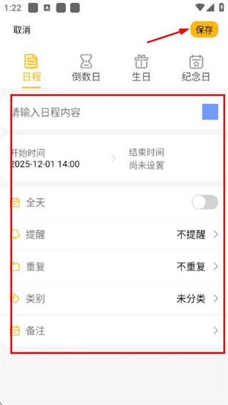 在日程添加页面填写好相关信息后,点击页面右上角的保存按钮,就能完成这个日程的添加操作。