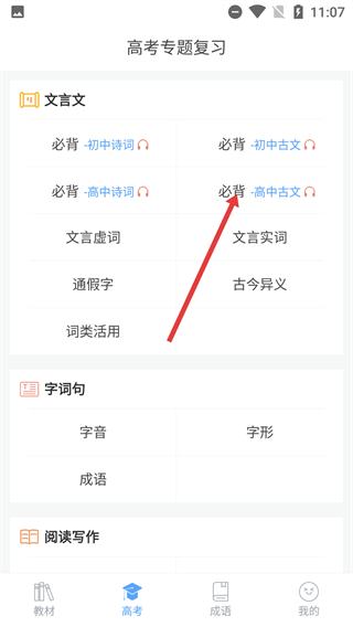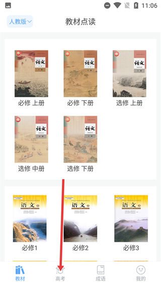进入【人教版】教材点读界面后,先选择对应的语文教材,再点击底部的【高考】按钮,即可切换到高考专题复习板块。