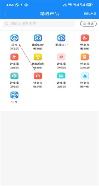 进入精选产品页面后,能看到项宝建企ERP等产品选项,点击“项宝”即可进入对应的产品详情页面。