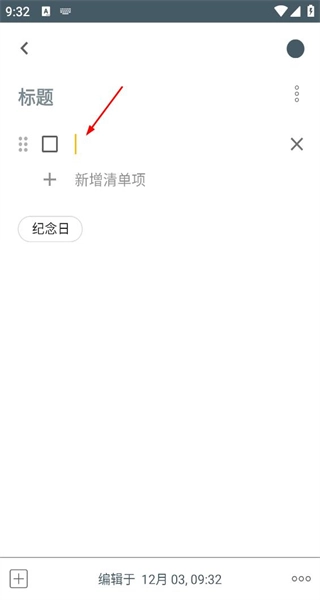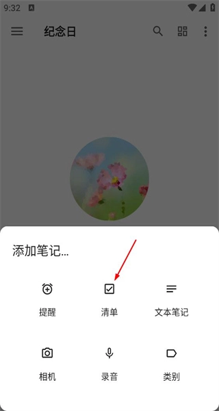 进入纪念日分类页面,点击添加笔记后选择清单选项,即可进入清单的编辑准备界面。