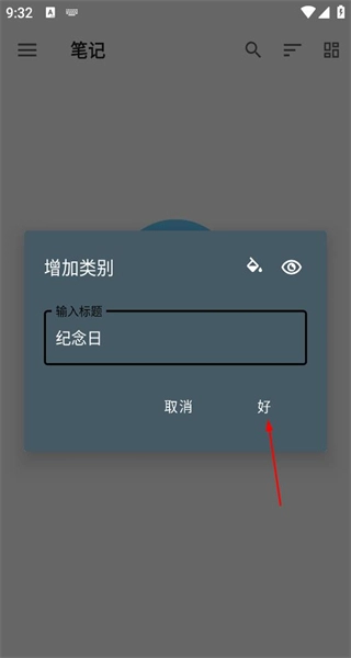 进入添加类别页面,在输入框中填写“纪念日”作为类别名称,点击“好”按钮即可完成该类别的创建。