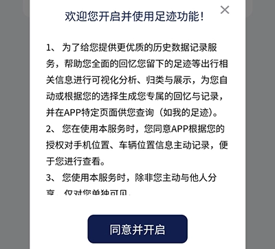 当弹出提示时,点击“同意并开启”,就能查看自己爱车的行驶足迹了。