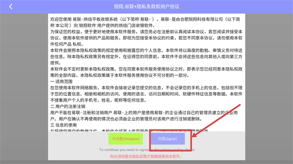 进入应用后,在《隐私条款和用户协议》页面,点击【同意(agree)】按钮以确认接受相关条款。