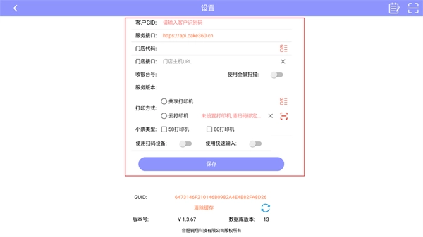 登录后进入“设置”页面,对客户ID、服务端口、门禁代码等参数进行配置,完成配置后点击【保存】按钮使设置生效。