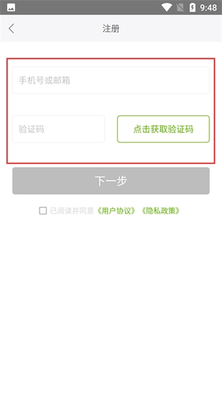 进入注册页面后,首先填写【手机号或邮箱】这一栏,接着点击【点击获取验证码】按钮来获取验证码并输入进去,然后点击下一步按钮继续完成注册流程。