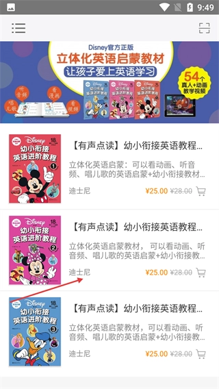 进入首页展示页面,就能看到【Disney-正版-立体化英语启蒙教材】对应的【有声点读-幼小衔接英语教程】商品,了解商品信息后可以进行购买。
