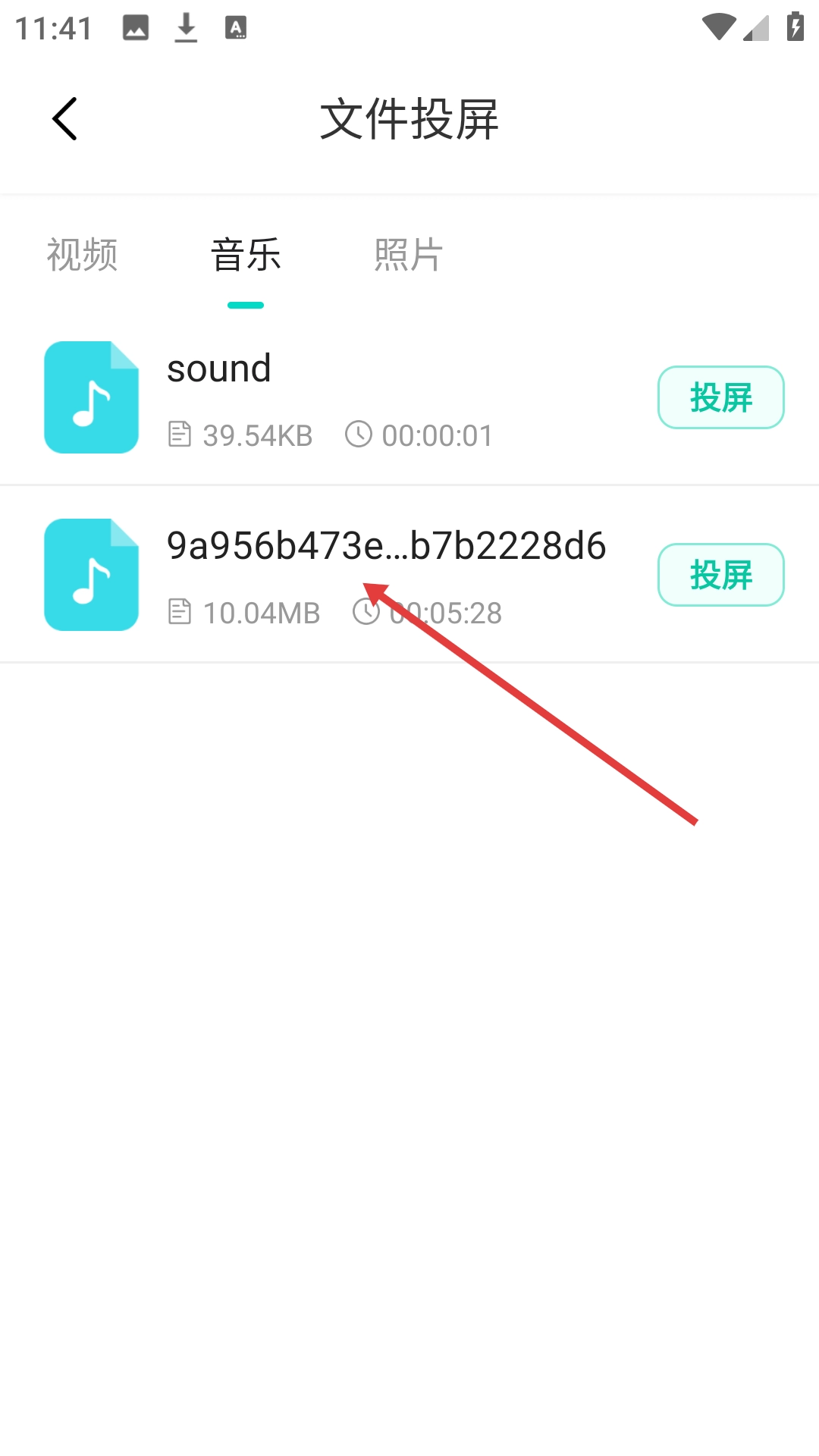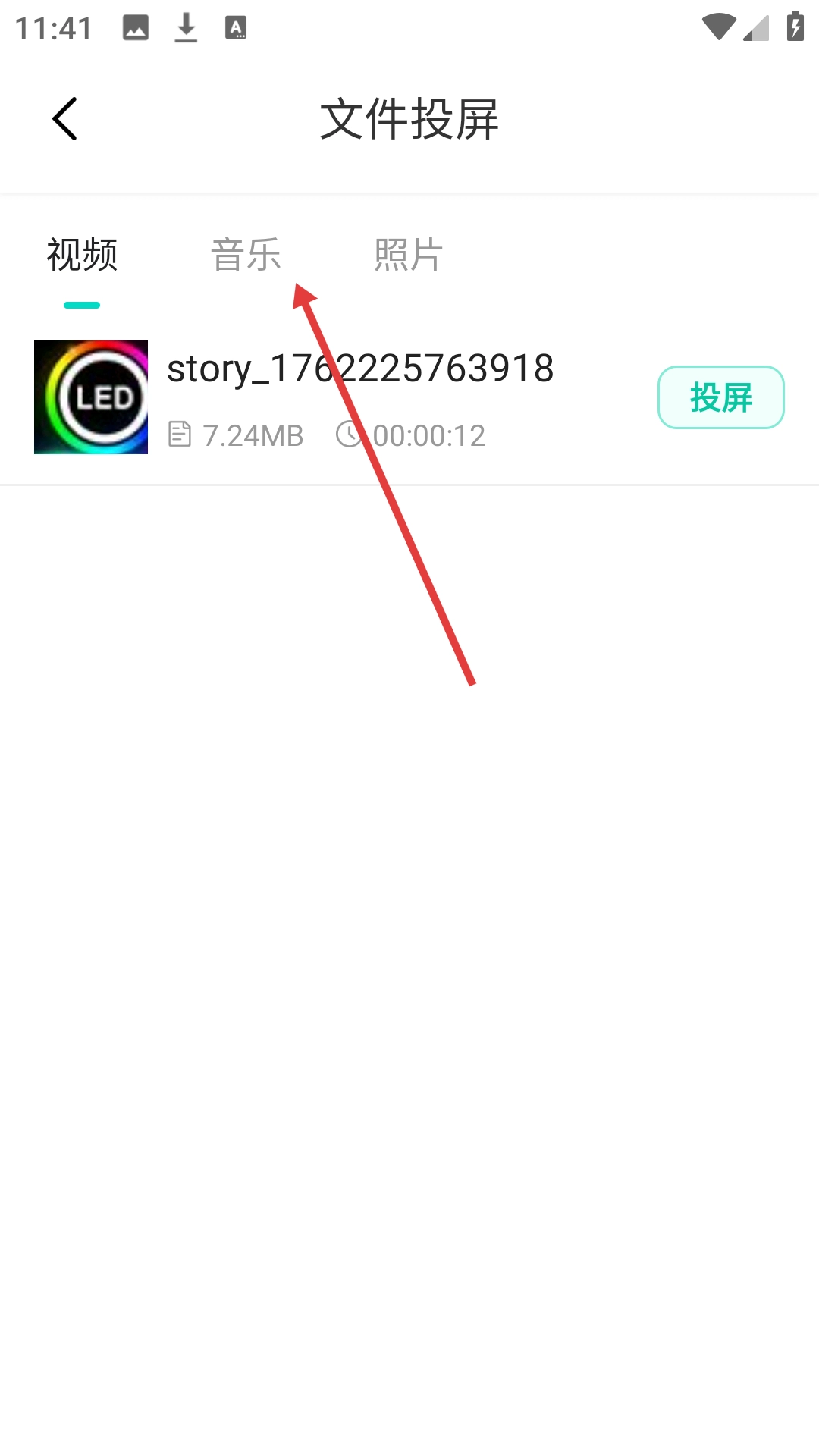 2、进入文件投屏页面后,点击【音乐】标签,即可切换至音乐投屏列表。