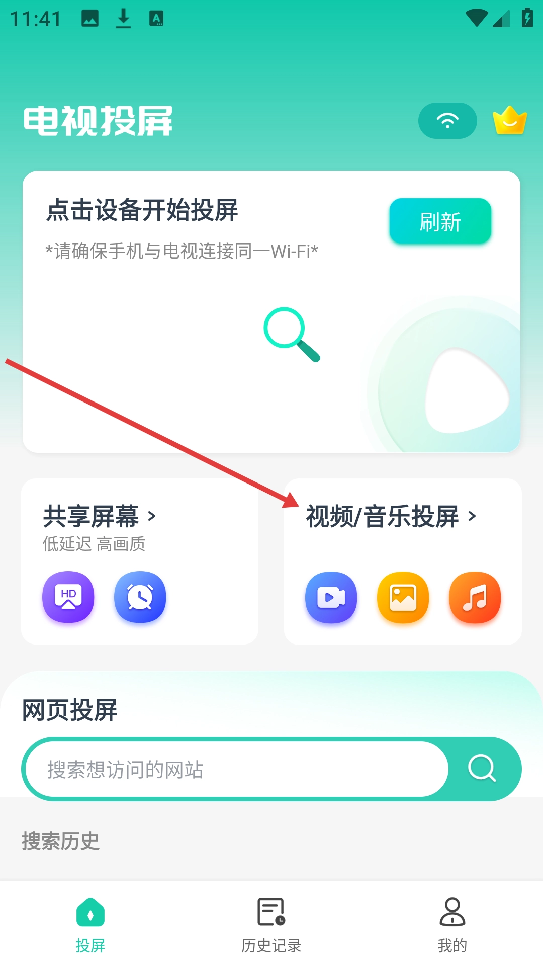 1、点击【视频/音乐投屏】,进入文件投屏页面。