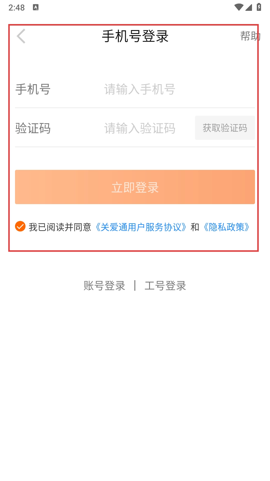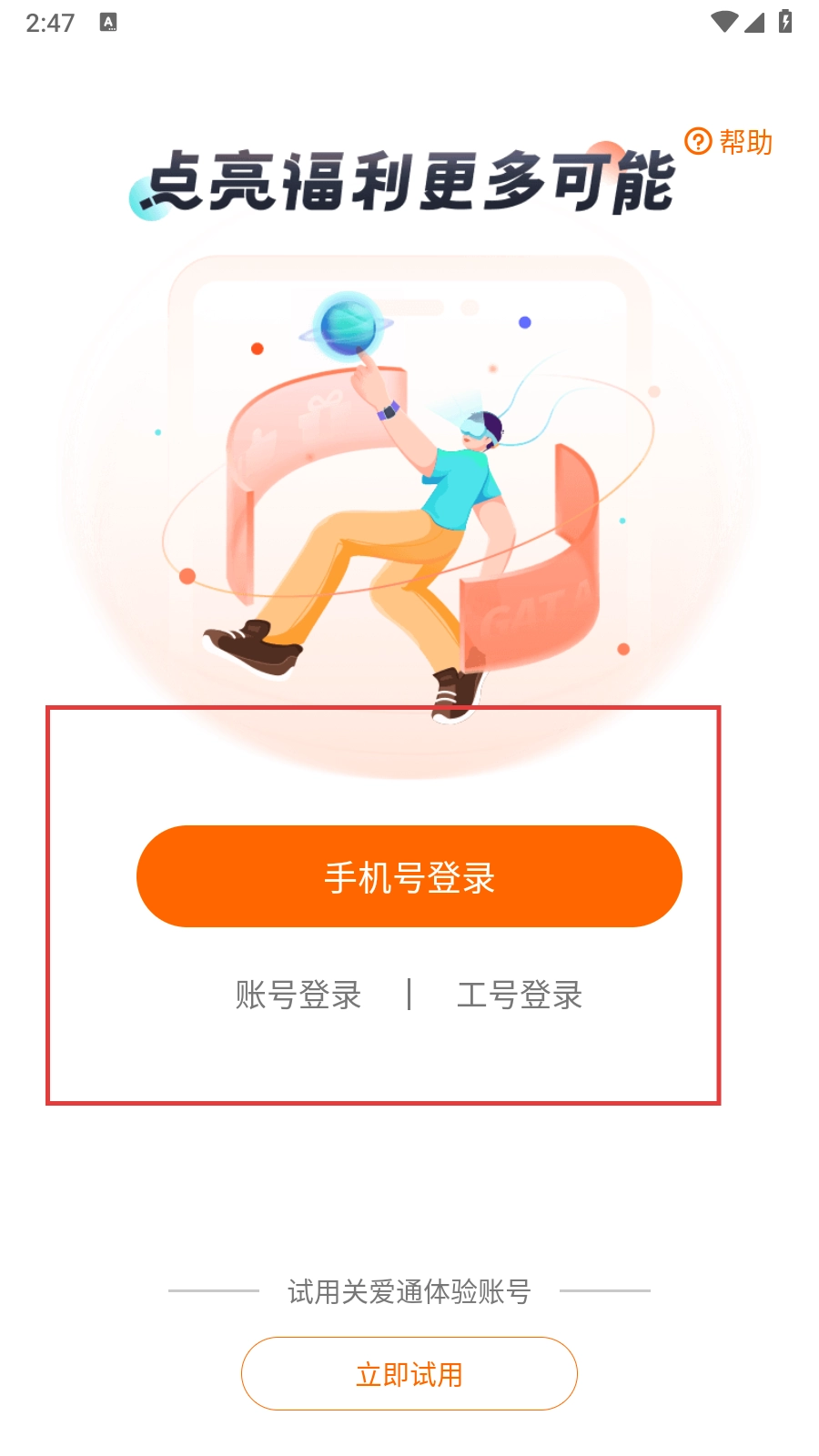 进入软件后,有三种登录方式可供选择,分别是【手机号登录】【账号登录】【工号登录】,此外还能点击【立即试用】来体验关爱通账号。
