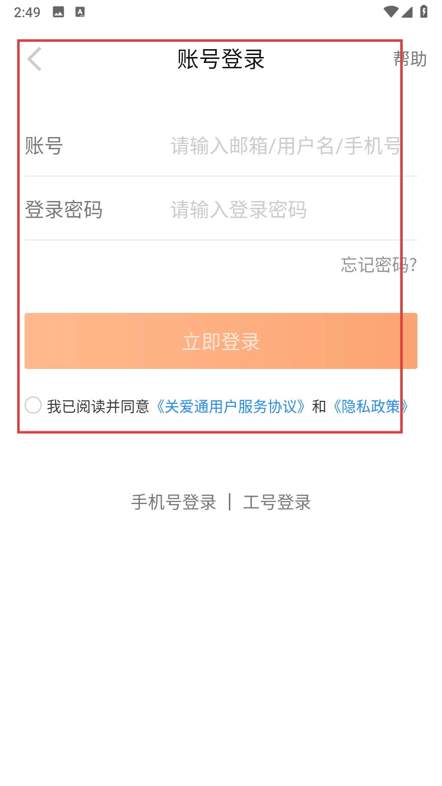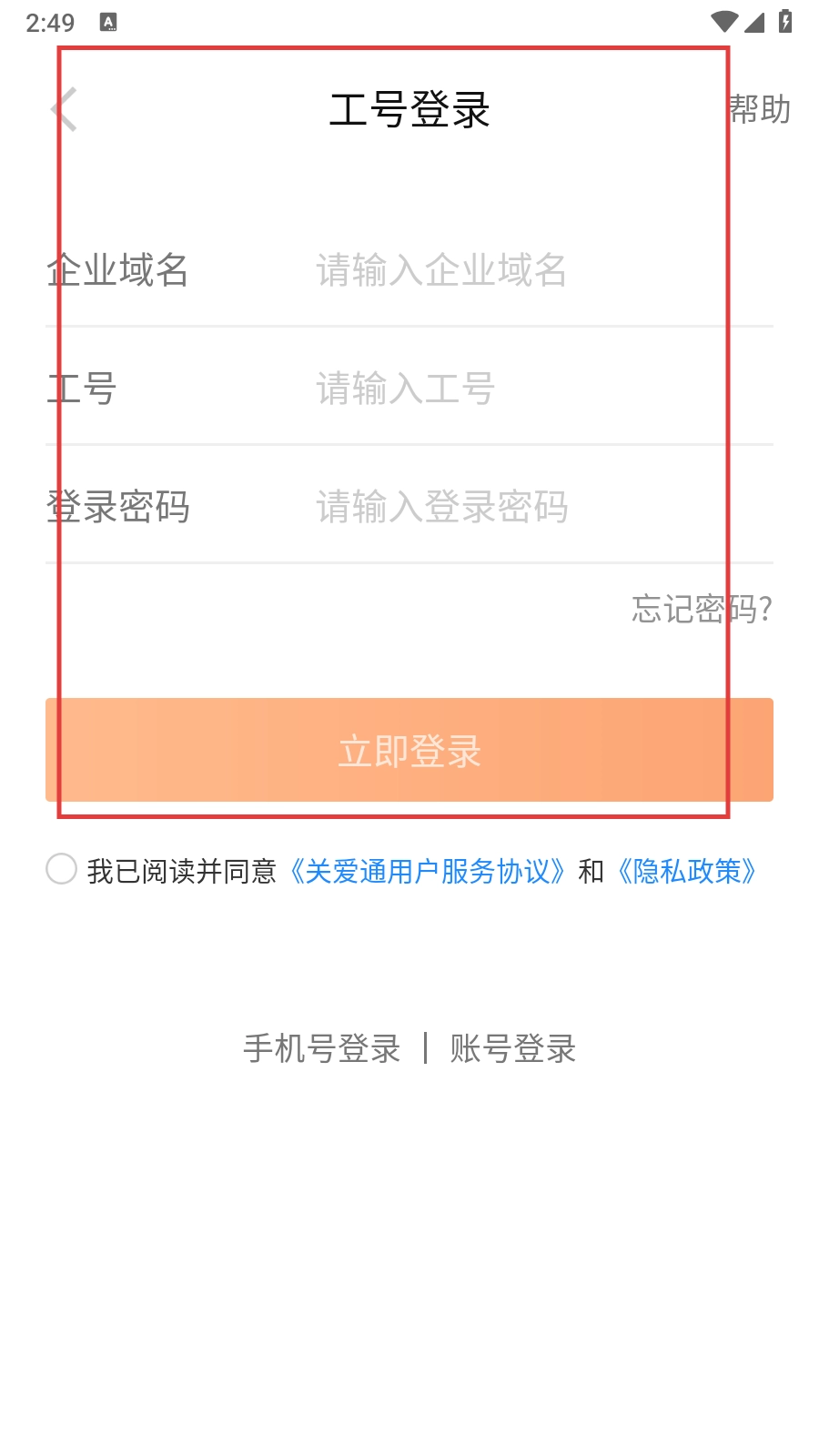 4、若选择【工号登录】,需依次输入企业域名、工号与登录密码,勾选同意相关协议后点击【立即登录】按钮即可;若忘记密码,可通过页面上对应的找回密码入口进行密码找回操作。