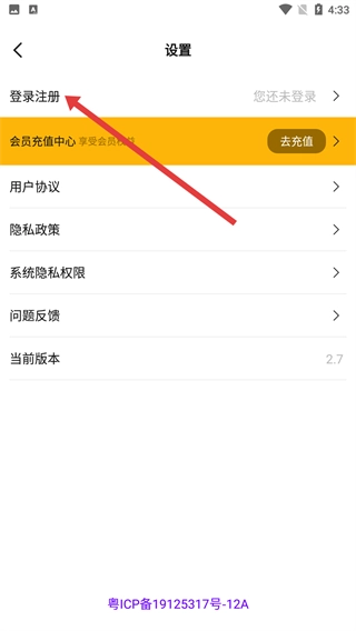 2、进入设置页面后,点击【登录注册】选项,即可进入账户登录界面,在此界面中,您可以选择通过账号密码进行登录,也可以选择快速注册的方式。