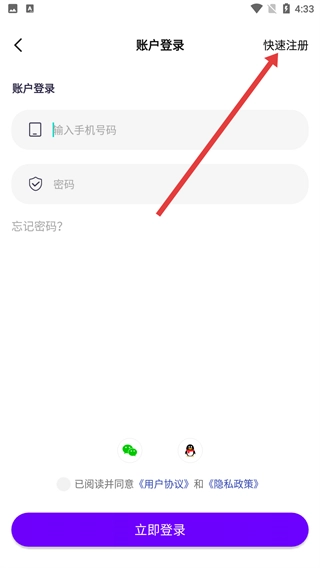 3、于账户登录界面点击【快速注册】按钮,跳转至账户注册页面后,依次填写手机号、验证码及密码,并勾选“已阅读并同意《用户协议》与《隐私政策》”的选项。