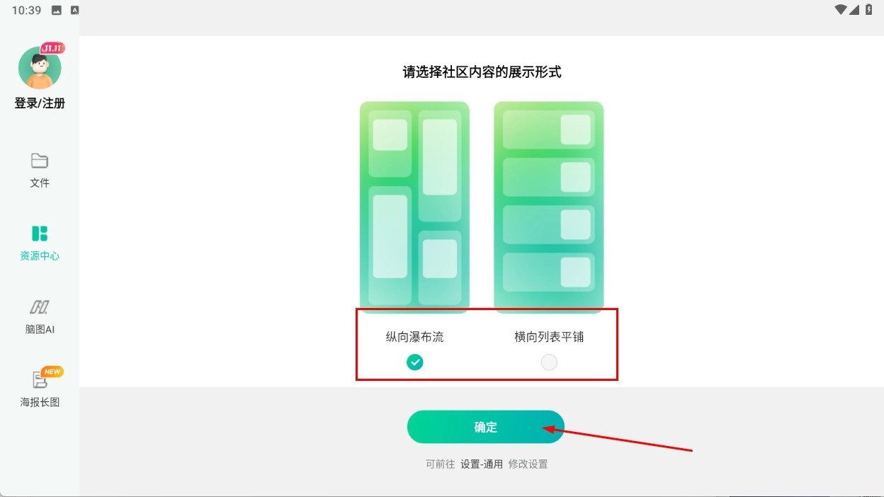 1、把社区内容的展示形式选定为【纵向瀑布流-展示形式】,之后点击【确定-功能按钮】。