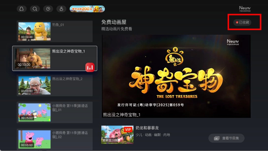 2、进入免费专区后,找到你感兴趣的动画内容,比如“熊出没之神奇宝物_1”,点击它就能进入播放页面了。