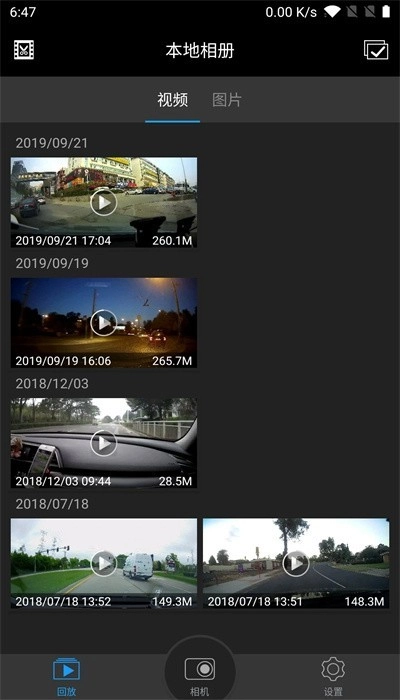 3、点击回放按钮,进入本地相册界面后,可通过切换视频、图片标签来查看对应的本地文件。
