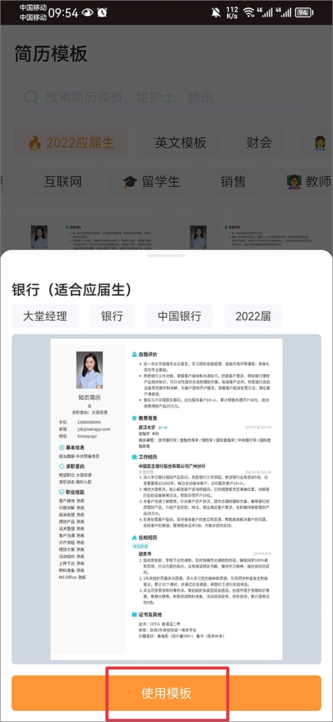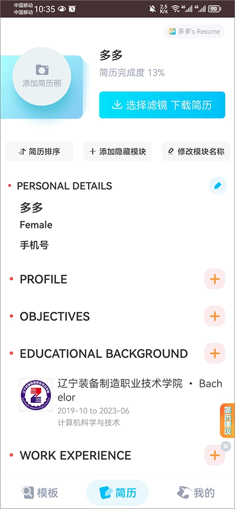 3、接着在模板简历里挑选你想要填入的内容,要是不需要填入内容的话,也可以不选择对应的模块。