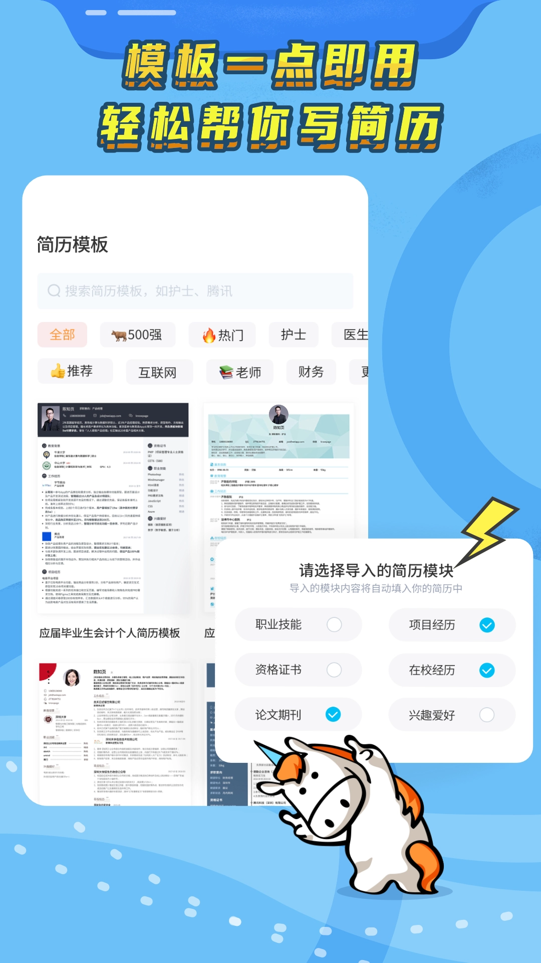 知页简历免费版是一款简历制作软件,用户通过填写个人履历,就能一键生成优质简历模板,软件还会提供简历制作的引导。刚毕业的同学若不清楚简历内容如何填写,可借助软件内的模板来辅助完成简历的回答与生成。