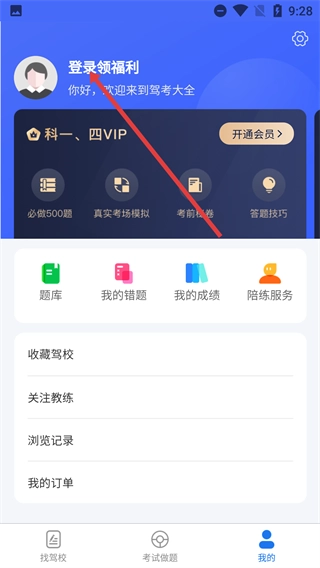 2、进入【我的】页面后,点击【登录领福利】完成账号登录,之后就能使用【题库】【我的错题】等与驾考练题相关的功能了。