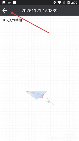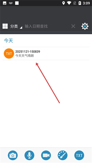 4、在主页面能够查看已保存的文字记录,例如“20251121-150839 今天天气晴朗”这样的内容。