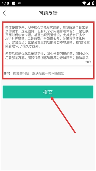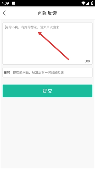 3、请在问题反馈页面的输入框内填写具体的反馈内容,之后再填写您的邮箱地址。